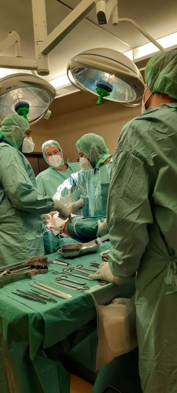 In der Regel übernimmt dies Oberarzt Dr.med. Christoph Barkhausen und sieht sich ambulante Patient*innen an, operiert, bearbeitet Konsile und visitiert bereits operierte Patient*innen. In der übrigen Zeit betreut das Team von Dr. Thiemann die Patient*innen auf der Station der Unfallchirurgie. Die Zusammenarbeit mit dem pflegerischen Team um Stationsleitung Beata Willems schätzen die Bielefelder Orthopäd*innen sehr, da sie mit Leib und Seele gern chirurgisch und sehr zuverlässig arbeiten. Auch in der Weiterbildung unterstützen sich die Bereiche standortübergreifend: Im Rahmen der Weiterbildung zum Facharzt für Orthopädie und Unfallchirurgie wurden die Bielefelder Kollegen, wie Sergej Becker und Boris Dick, bei Dr. Thiemann und die Haller Kollegen, wie Sarwan Bali und Dan Ciurel, in Bielefeld zum Facharzt weitergebildet. Orhan Kizilpinar kam 2020 als Oberarzt aus Bielefeld zu Dr. Thiemann in die Unfallchirurgie.