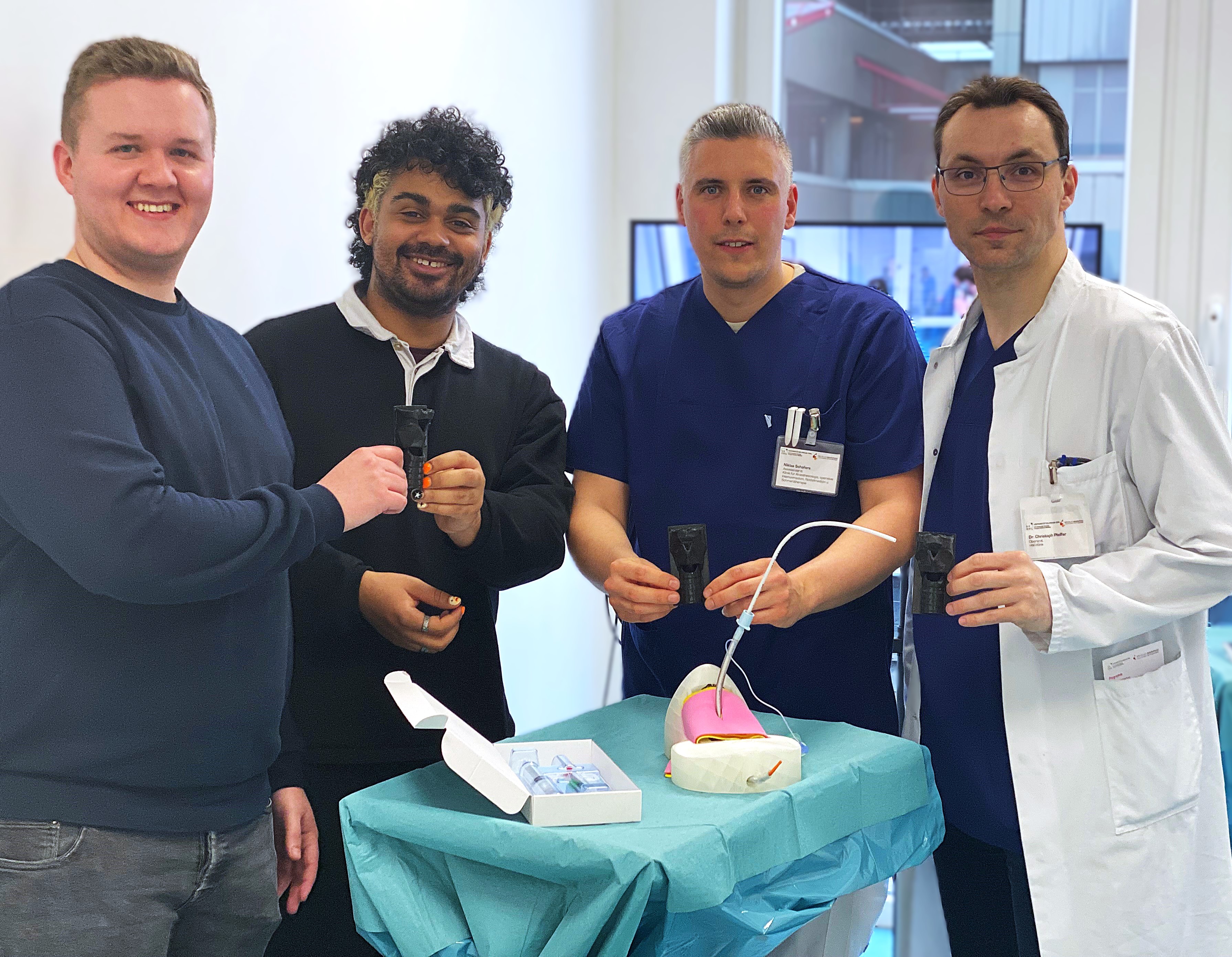 Marvin Förster und Justin Owusu Boamah vom BITS SPACE der Universität Bielefeld, Niklas Schäfers vom Zentrum für Anästhesiologie, operative Intensivmedizin, Notfallmedizin und Schmerztherapie sowie Dr. med. Christoph Pfeiffer von der Universitätsklinik für Hals-Nasen-Ohrenheilkunde, Kopf- und Halschirurgie haben gemeinsam an den 3D-Modellen gearbeitet, die für das Medizinstudium eingesetzt werden sollen. (v.l.n.r.)
