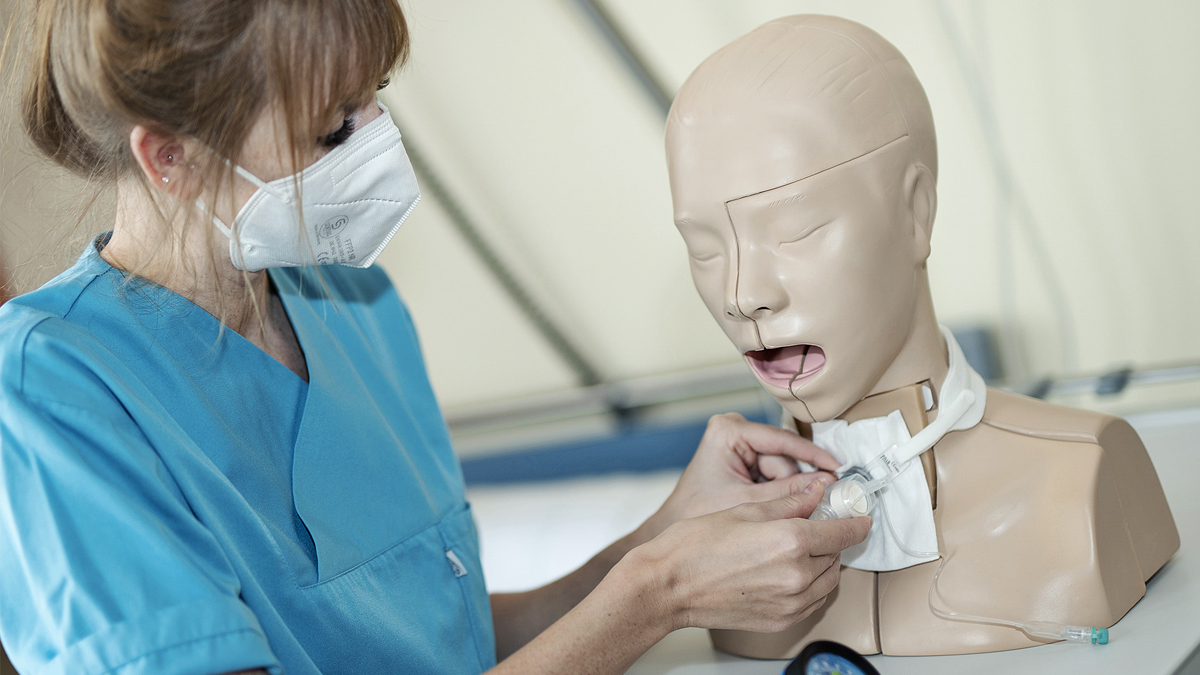 Welche Fragen und Ängste Patient*innen mit einem Tracheostoma haben, weiß Antonia Olfert. Sie ist Gesundheits- und Krankenpflegerin und arbeitet seit 2011 auf der Ebene 10 im Klinikum Bielefeld Mitte, wo Patient*innen der Universitätsklinik für Hals-Nasen-Ohrenheilkunde behandelt werden. Unter anderem absolvierte sie die Weiterbildung zur Tracheostoma-Fachtherapeutin und bietet selbst Schulungen für Mitarbeitende zum Umgang mit einem Tracheostoma an. „Ich arbeite gerne in diesem Beruf und vor allem auch in diesem speziellen Bereich. Man stellt sich jeden Tag der Herausforderung, unsere Patient*innen und deren Angehörige in einer sehr schweren Situation zu unterstützen, zu begleiten, Hilfestellung zu geben und ihnen damit viel Lebensqualität zurückzugeben“, erzählt die 31-Jährige. Schwierigkeiten eines Tracheostomas sind Einschränkungen, die beim Sprechen, Schlucken und Atmen auftreten – Dinge, die Menschen sonst ohne weiteres Nachdenken tun. Außerdem ist das Tracheostoma sowie die Kanüle äußerlich sehr offensichtlich und schwer zu verstecken, wodurch ein verändertes Selbstbild und Schamgefühle entstehen können. Patient*innen müssen lernen, selbständig damit zu leben und die Fachtherapeutin erklärt, dass Betroffene unterschiedlich schnell verarbeiten können und den Umgang mit einem Trachestoma erlernen. Darum ist es wichtig, individuell auf die Patient*innen und deren Angehörigen einzugehen und dementsprechend Hilfestellung, Beratung und Anleitung anzubieten. „Dabei ist der Dummy eine große Hilfe, um Patient*innen zu demonstrieren, wie genau eine Trachealkanüle funktioniert, sowie das Vorführen der Tracheostomapflege und das Endotracheal-Absaugen“, weiß Antonia Olfert zu berichten.