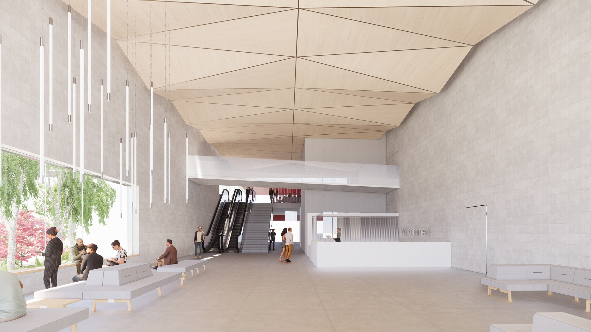 Der Eingangsbereich des Klinikums wird auf dem Niveau der Teutoburger Straße gebaut. Neben der capella hospitalis entsteht ein neu gepflasterter Weg in die neue Eingangshalle, in der sich ein heller und großzügig gestalteter Empfangsbereich sowie der Zugang zum Erdgeschoss über Rolltreppen und Fahrstühle befinden. Die Zufahrt für Taxen wird von der Teutoburger Straße aus erfolgen, ebenso entsteht eine Tiefgarage mit Kurzzeitparkplätzen für Angehörige und Fahrer*innen sowie mit Dauerparkplätzen für Mitarbeitende, die somit trockenen Fußes die Eingangshalle erreichen können. Verlegungsfahrten von Patient*innen werden um das Gebäude herum geleitet, sodass die Wegeführung von Verlegungsfahrten, Rettungswagen und Taxen getrennt voneinander verläuft.