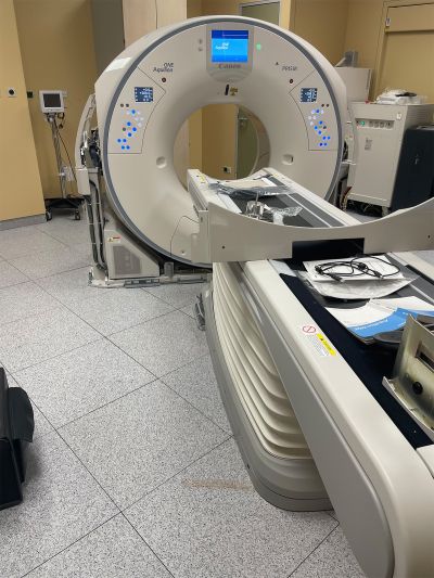 Das High-End-CT-System Aquillion Prism von der Firma Canon am Klinikum Bielefeld - Mitte kann nicht nur Spiraluntersuchungen, sondern auch Volumenuntersuchungen durchführen. Hierdurch wird ein Volumen von 16 cm mit einer Rotation der Röntgenröhre untersuchbar und es sind nicht mehr, wie früher, mehrere Umdrehungen nötig. So wird die Patientendosis und die Untersuchungszeit deutlich reduziert.