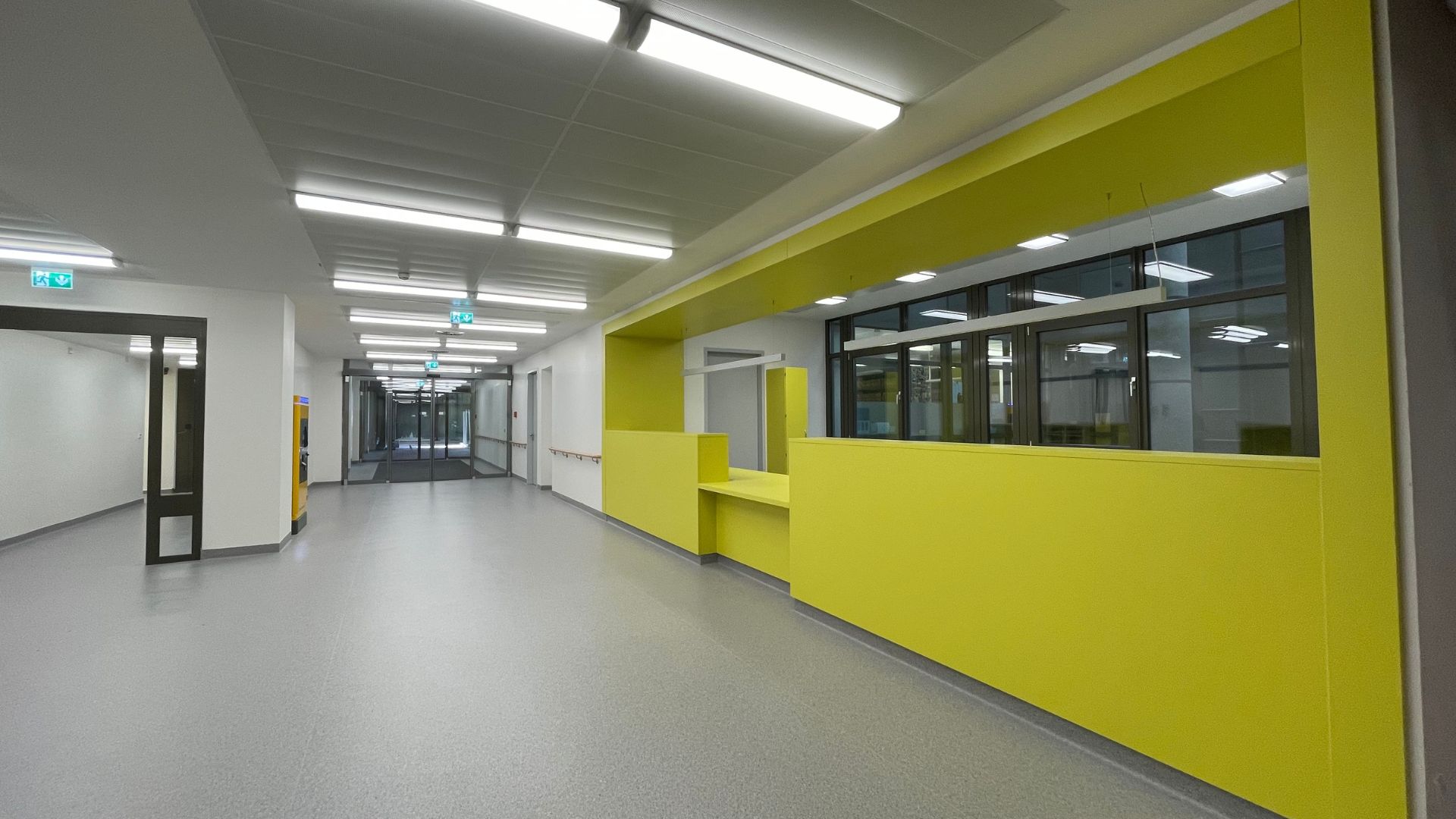 Der neue Haupteingang für Patient*innen und Besucher*innen befindet sich dann auf der Ebene U1. Hier wurde ein entsprechender Eingangsbereich mit einem Tresen für die Mitarbeitenden der Information errichtet. Patient*innen und Besucher*innen gelangen ab dem 8. Mai über den Treppenaufgang oder die Fahlstühle in U1 zu den Stationen, der Zentralen Notaufnahme, der Notfallpraxis für Erwachsene, der Aufnahme und den Ambulanzen.