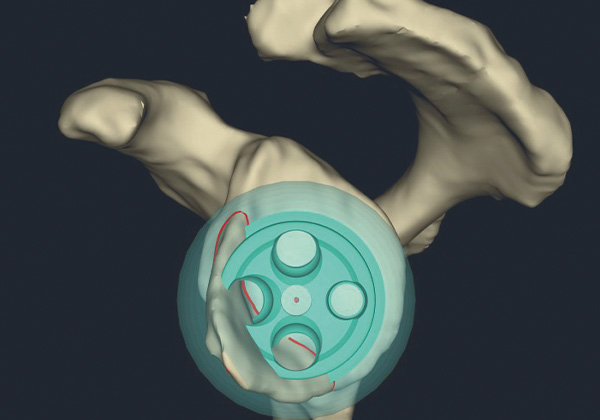 Besonderes Augenmerk liegt dabei auf der Schulterblattseite – der Pfanne – des Gelenkes. Im Rahmen der Verschleißerkrankungen kommt es teils zu erheblichen Gelenkflächenabnutzungen. Durch die präoperativen dreidimensionalen Analysen ist es möglich, eine optimierte Positionierung des pfannenseitigen Implantates mit Ausgleich der Defektsituation - sei es durch körpereignen Knochen oder metallische Augmente - zu erzielen.