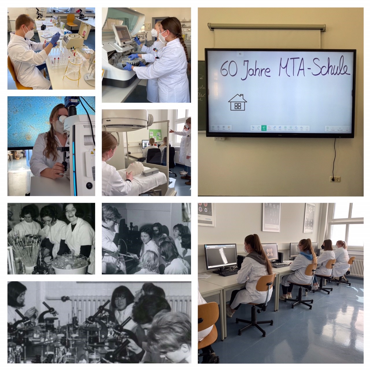 Doch was bedeutet „MTA“?- diese drei Buchstaben sind die Abkürzung für Medizinisch-Technische Assistentin oder Medizinisch-Technischer Assistent. Mit der kommenden Reform des Berufes 2023, in der erweiterte Kompetenzen festgelegt werden ändert sich auch die Berufsbezeichnung. Die Berufe mit Zukunft im Gesundheitswesen heißen jetzt Medizinische Technolog*innen für Laboranalytik (MTL) und Medizinische Technolog*innen für Radiologie (MTR). Die MTA-Schule am Klinikum Bielefeld ist eine der erfahrensten und zugleich modernsten in Deutschland. Seit im Jahre 2002 umfangreiche Umbau- und Renovierungsmaßnahmen abgeschlossen wurden, verfügt die heute 60 Jahre bestehende MTA-Schule über moderne Unterrichtsräume. Eine zeitgemäße Geräteausstattung bietet hervorragende Möglichkeiten, die Auszubildenden auf die künftigen Anforderungen im Beruf vorzubereiten. Bei der Teilnahme am Deutschen Schulpreis 2018 erlangte die Schule einen der vorderen Plätze und gehört somit zu den Top 50.Zur Feier des 60- Jährigen Jubiläums stellt die Schule in einer Collage den technischen Fortschritt und die weiteren Entwicklungen aus den 60er Jahren bis heute, 2022, gegenüber.