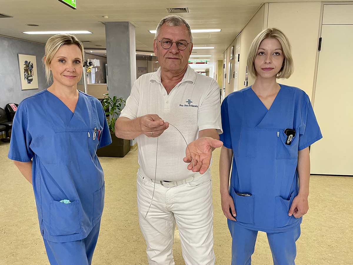 Priv. Doz. Dr. med. Bert Hansky, Oberarzt und Sektionsleiter kardiale Implantate in der Klinik von Prof. Stellbrink, führte den Eingriff durch: „Ich freue mich sehr, dass nun nach 20 Jahren der Entwicklung die erste Implantation dieser neuartigen Elektrode bei uns am Klinikum Bielefeld vorgenommen wurde. Das ist sowohl für uns als auch für die Patientinnen und Patienten, die auf die Implantation eines Defibrillators angewiesen sind, ein Meilenstein.“