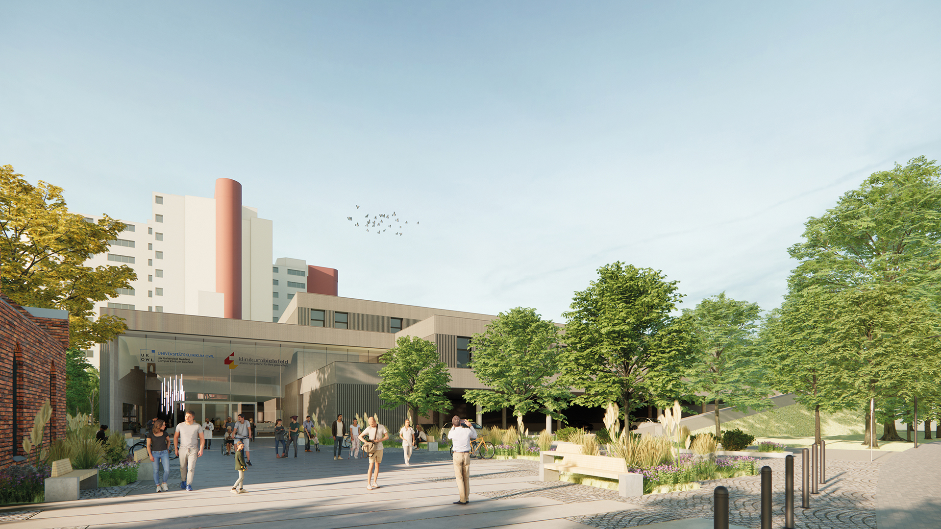 Der Eingangsbereich des Klinikums wird auf dem Niveau der Teutoburger Straße gebaut. Neben der capella hospitalis entsteht ein neu gepflasterter Weg in die neue Eingangshalle, in der sich ein heller und großzügig gestalteter Empfangsbereich sowie der Zugang zum Erdgeschoss über Rolltreppen und Fahrstühle befinden. Die Zufahrt für Taxen wird von der Teutoburger Straße aus erfolgen, ebenso entsteht eine Tiefgarage mit Kurzzeitparkplätzen für Angehörige und Fahrer*innen sowie mit Dauerparkplätzen für Mitarbeitende, die somit trockenen Fußes die Eingangshalle erreichen können. Verlegungsfahrten von Patient*innen werden um das Gebäude herum geleitet, sodass die Wegeführung von Verlegungsfahrten, Rettungswagen und Taxen getrennt voneinander verläuft.