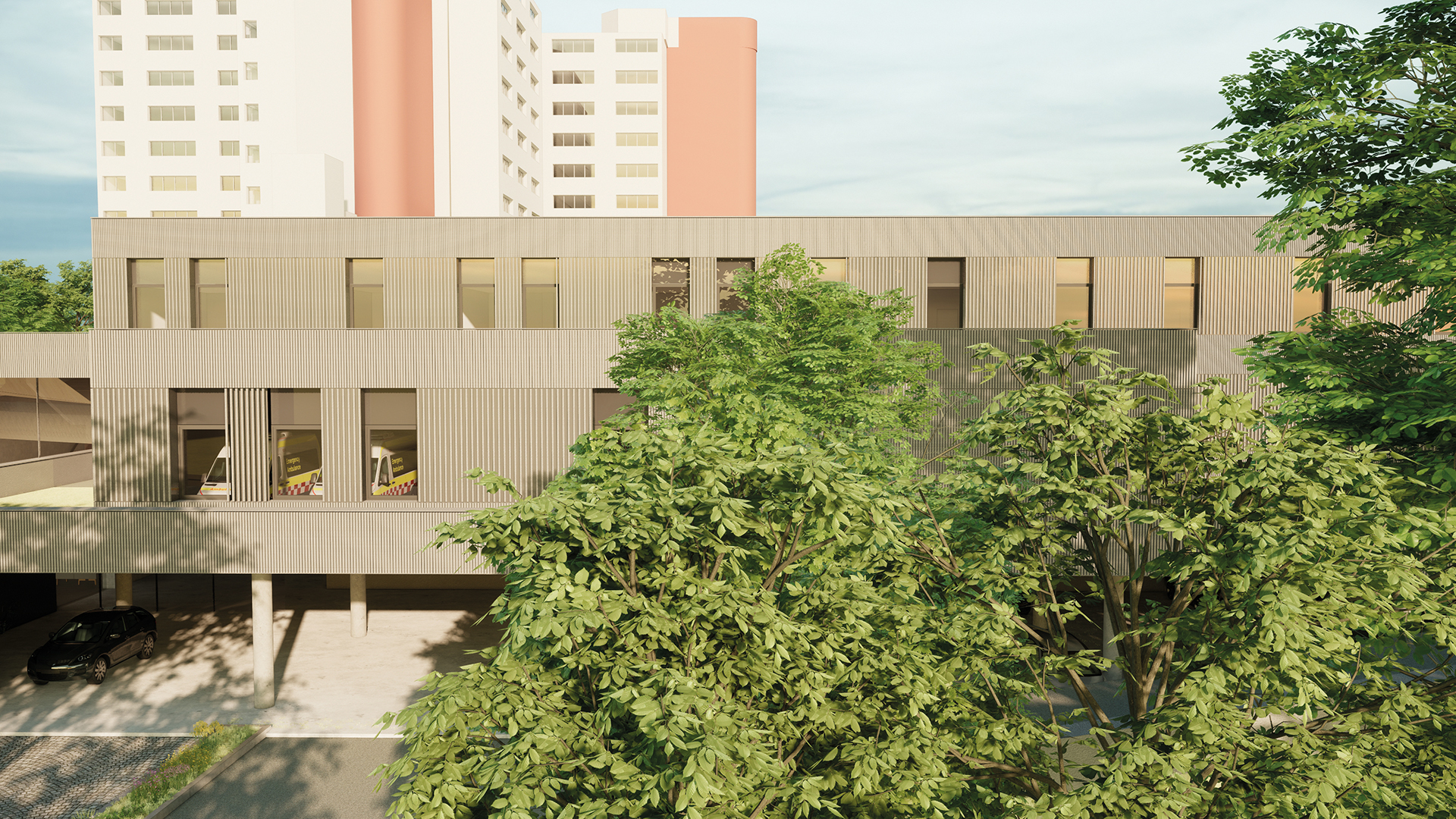 Im Erdgeschoss befindet sich die Liegendkrankenvorfahrt für Rettungswagen. In einer neu gebauten Wagenhalle haben bis zu sechs Rettungswagen Platz. Die Liegendkrankenvorfahrt erreicht man von der Teutoburger Straße über ein Plateau auf Erdgeschossniveau. Die bauliche Struktur folgt dem Prozess in der Notfallversorgung und ergibt eine optimale Wegeführung für fußläufige und liegende Patient*innen sowie einen infektionsisolierten Zugang.
