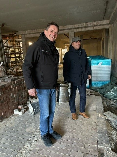 Zur Lösung der Verschalung bracht Michael Ackermann, Geschäftsführer des Klinikums Bielefeld, das warme Mittagessen persönlich auf die Baustelle und danken den Handwerkern: „Eine gute Raumakustik und Klimaregulierung sind wichtig für unsere neue Eingangshalle. Die Stampflehm-Wand bringt diese Eigenschaften mit und schafft als erste ihrer Art in einer Gesundheitseinrichtung ein einzigartiges Raumgefühl.“