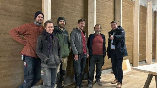 Stampflehm ist ein Naturprodukt uns wurde bereits in der Steinzeit zum Bauen benutzt. Diese alte Technik beherrschen heute Spezialfirmen: Die Zimmerei Heinrichs aus dem benachbarten Hiddenhausen verbaute in drei Wochen rund 18 Tonnen Lehm. Seit 25 Jahre bringt Hubert Heinrichs Stampflehm an: „Die sieben Kolleginnen und Kollegen hier vor Ort im Team sind allesamt aufgrund der besonderen Aufgabe hier. Sie wollen lernen, wie dieser uralte Baustoff modern und professionelle verarbeitet wird.“